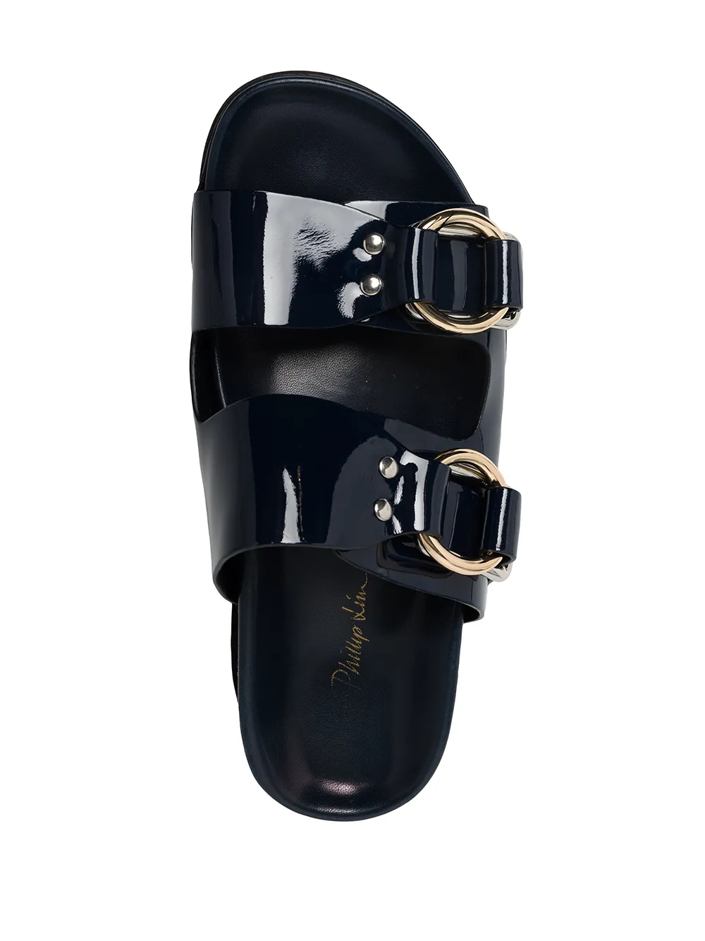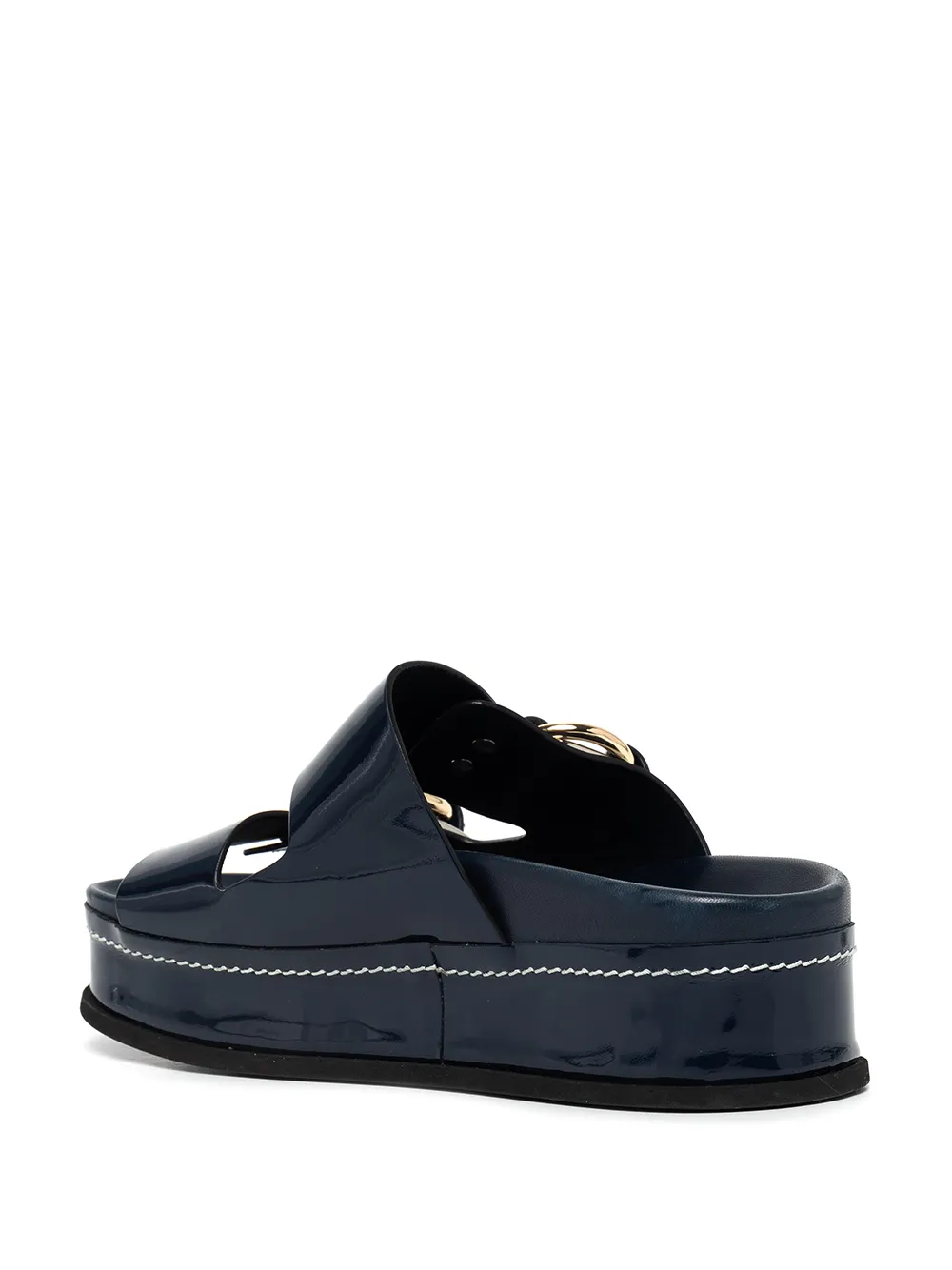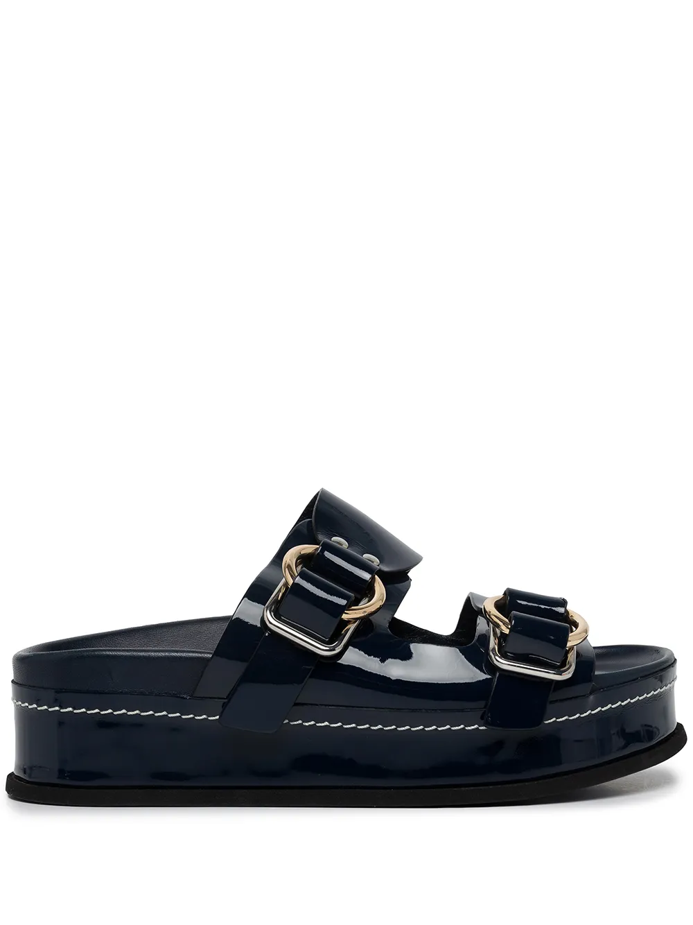 These Freida slides from 3.1 Phillip Lim contrast smooth, sensual surfaces with contemporary details. Crafted from high-shine patent leather in a midnight blue hue, the pair are punctuated by the chunky buckle details and lofty platform sole.