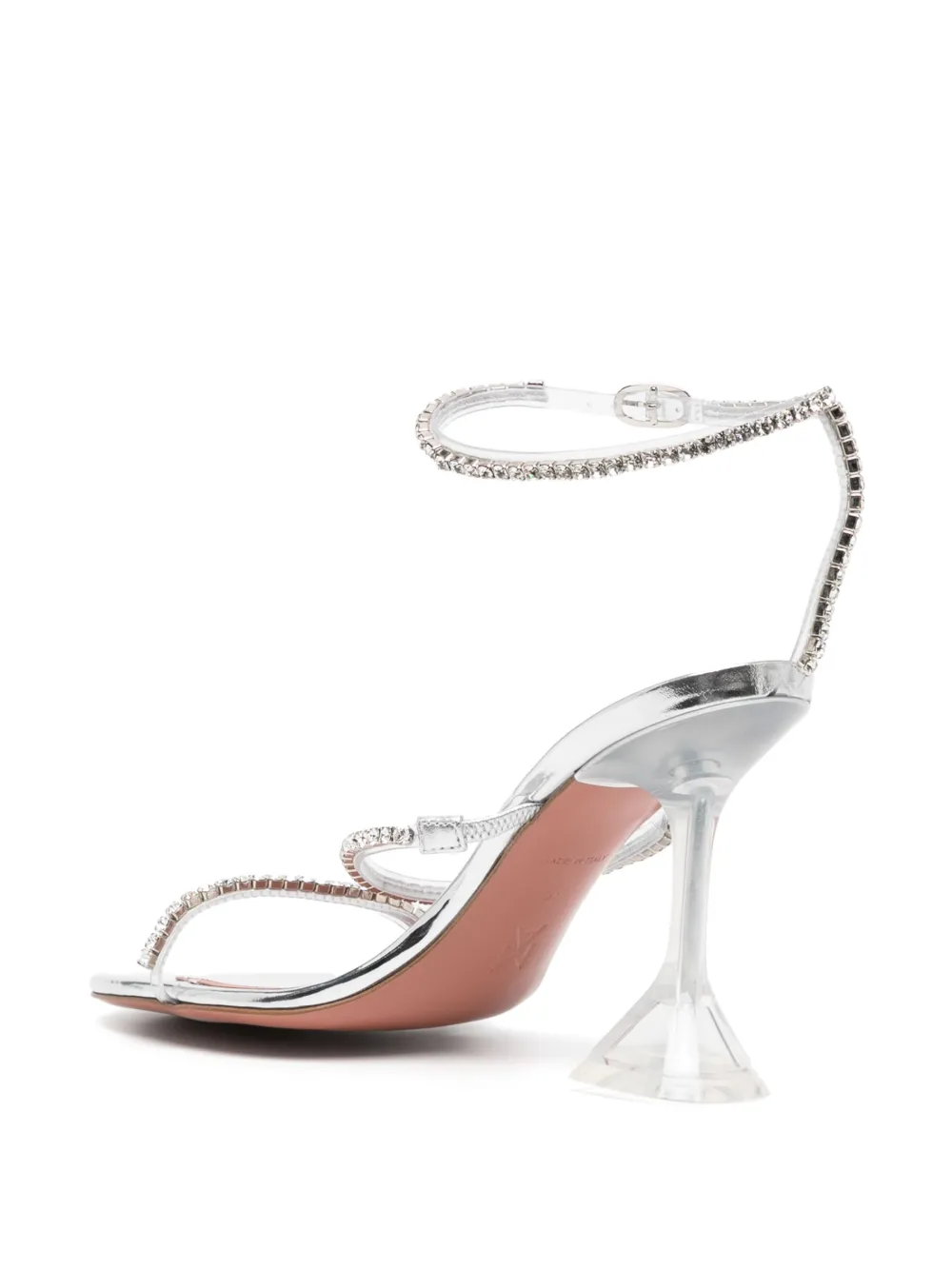 Amina Muaddi’s striking silhouettes are often intricated with embellishments for a signature glamour touch, as seen in these Gilda Glass sandals. Resting atop the brand’s famous fluted heels, the pair comes in a transparent design punctuated with silver-tone crystals.