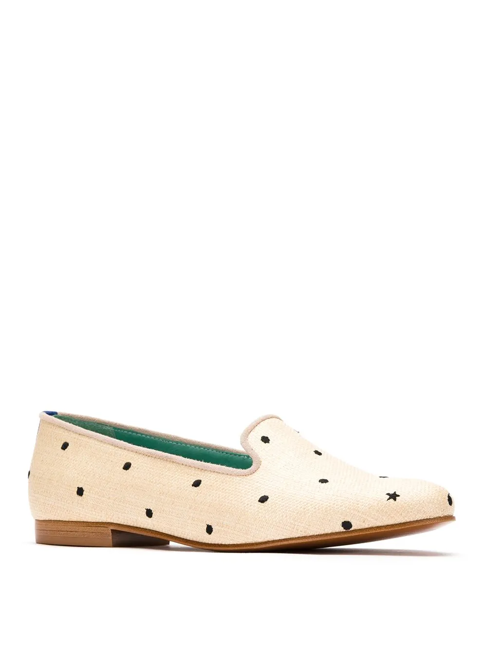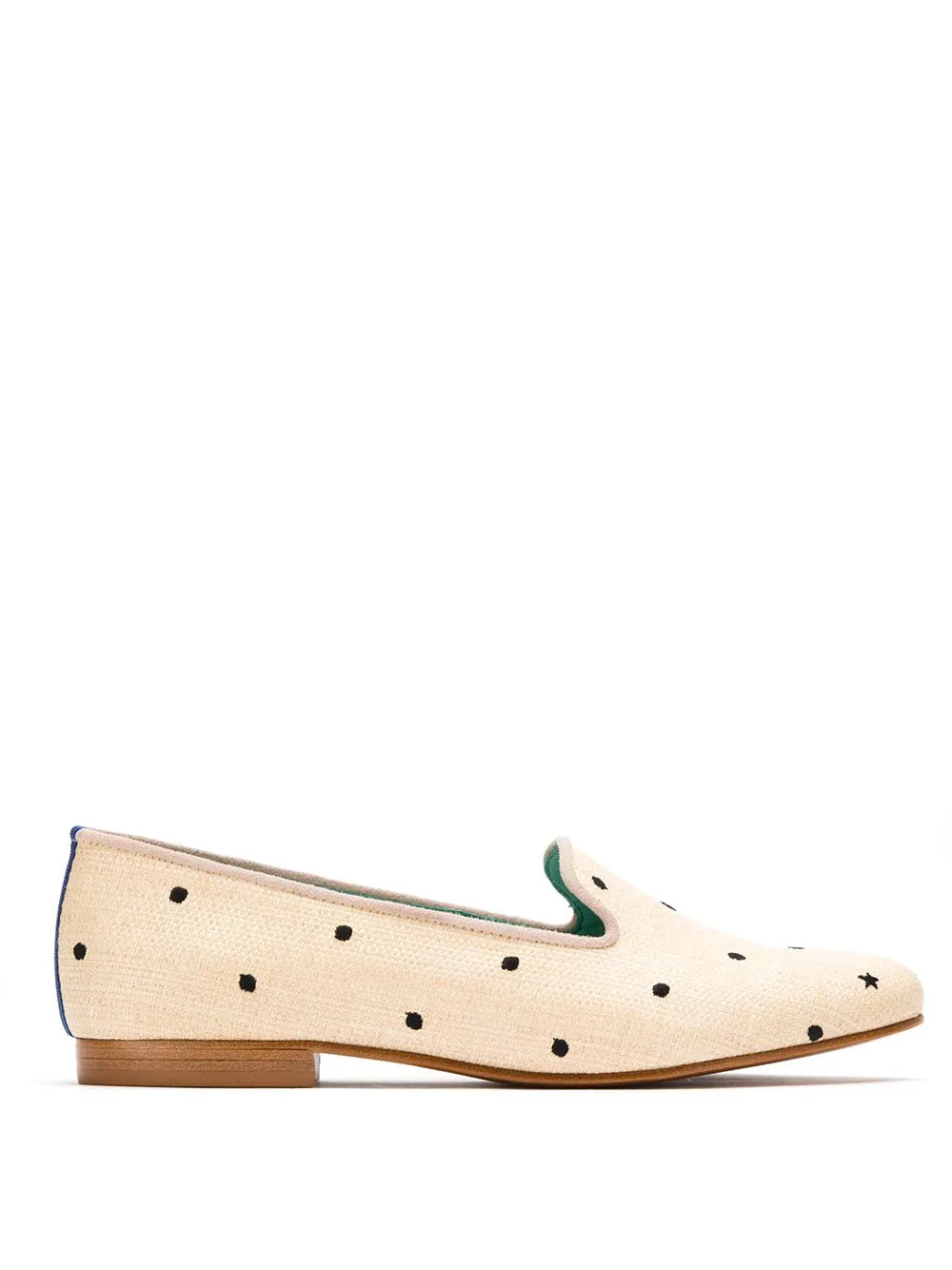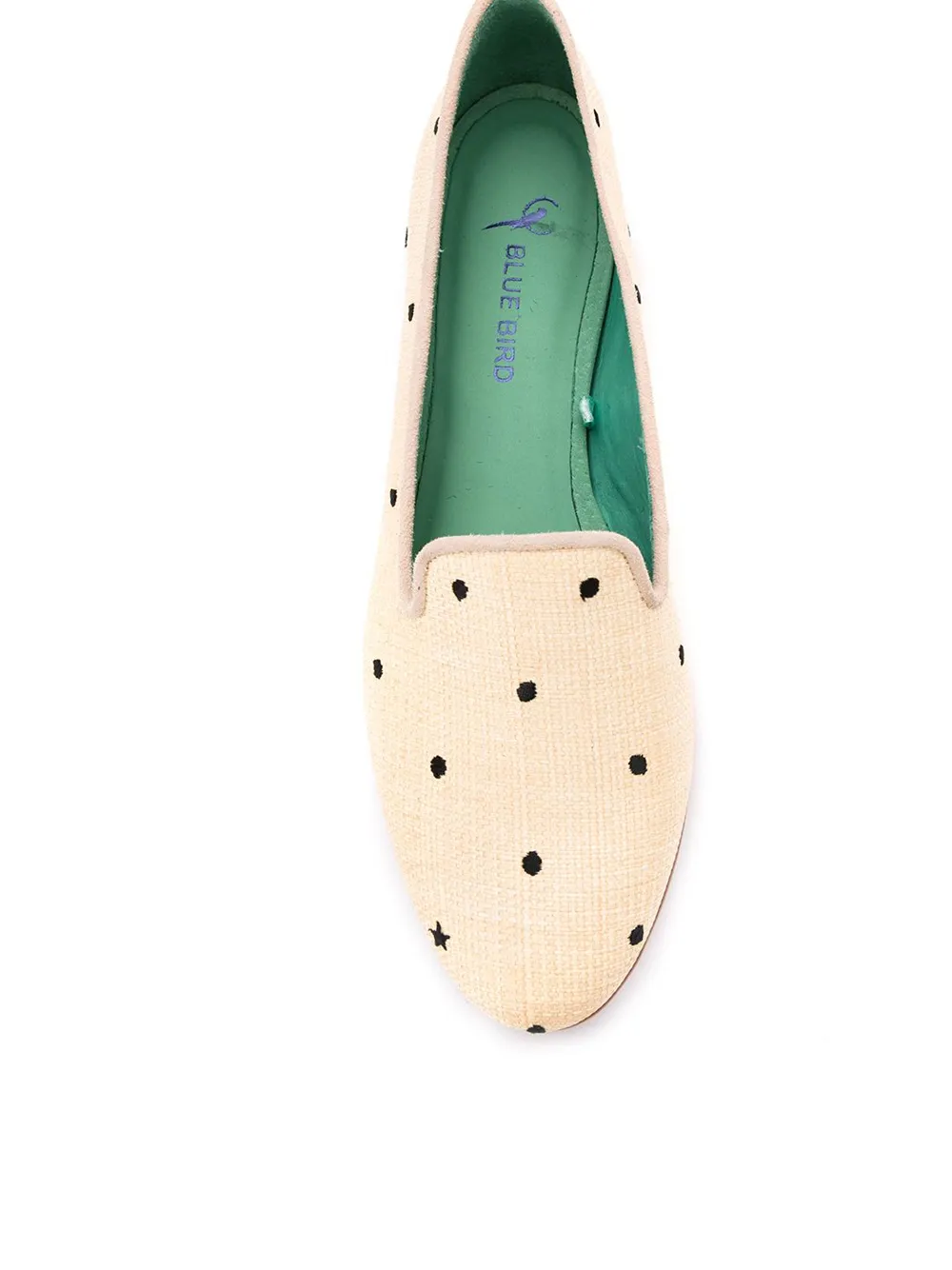 Nude straw embroidered slippers from Blue Bird Shoes featuring a round toe, a polka dot pattern, a bias cut finish and a flat heel.