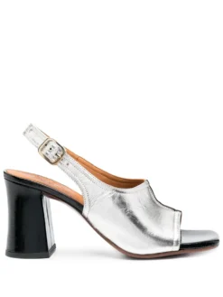85mm open-toe sandals from CHIE MIHARA featuring silver-tone, calf leather, metallic effect, open toe and high block heel.