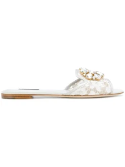 Definitive directors of Italian decadence, Dolce & Gabbana return with the exquisite Bianca sandals, crafting an open toe silhouette from leather and lace, embellished with an cluster of gemstones towards the front. The chic design is finished with a low heel and a branded leather sole.