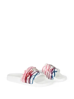 Silver tone leather Anya Bouche-motif slides from Giuseppe Zanotti featuring open toe, branded insole, flat sole and triple strap design.