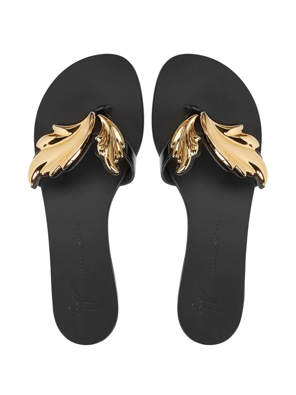 Cruel flat leather flip-flops from Giuseppe Zanotti featuring black, leather, gold-tone hardware, thong strap, round toe, branded insole and flat rubber sole.
