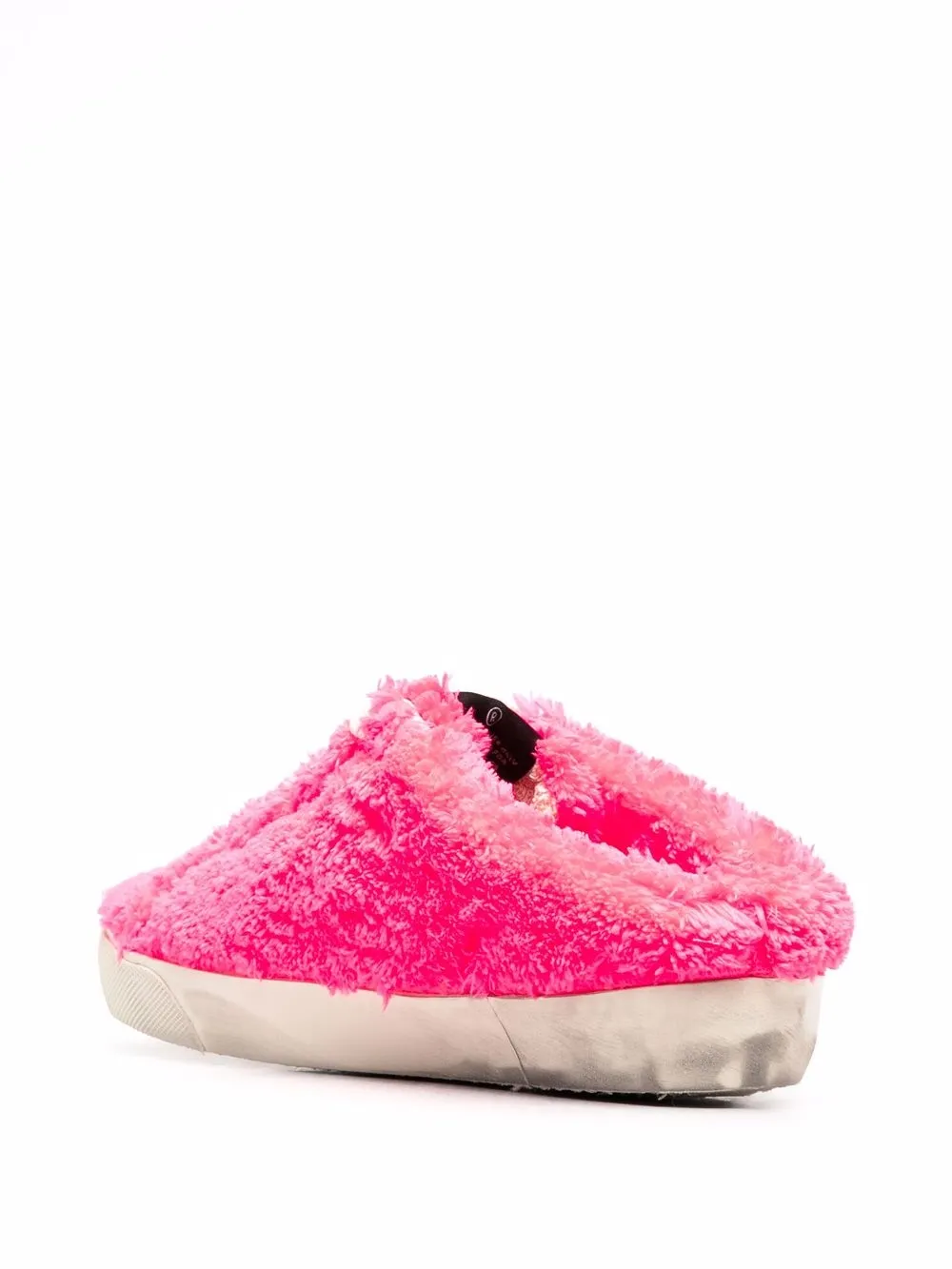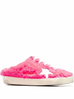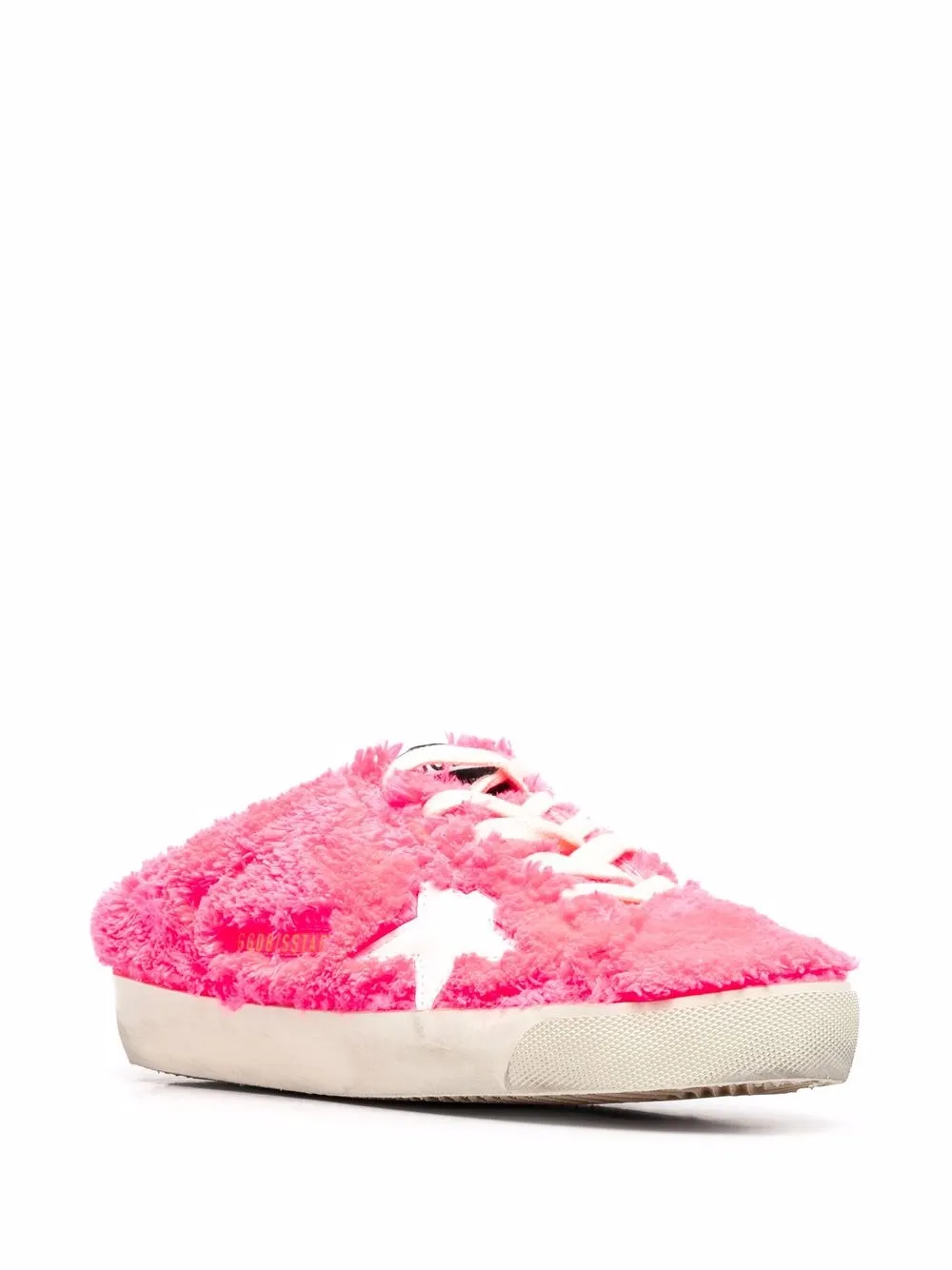 Pink shearling lace-up slippers from Golden Goose featuring faux-shearling design, signature star patch to the sides, front lace-up fastening, round toe, shearling trim, slip-on style and flat rubber sole.
