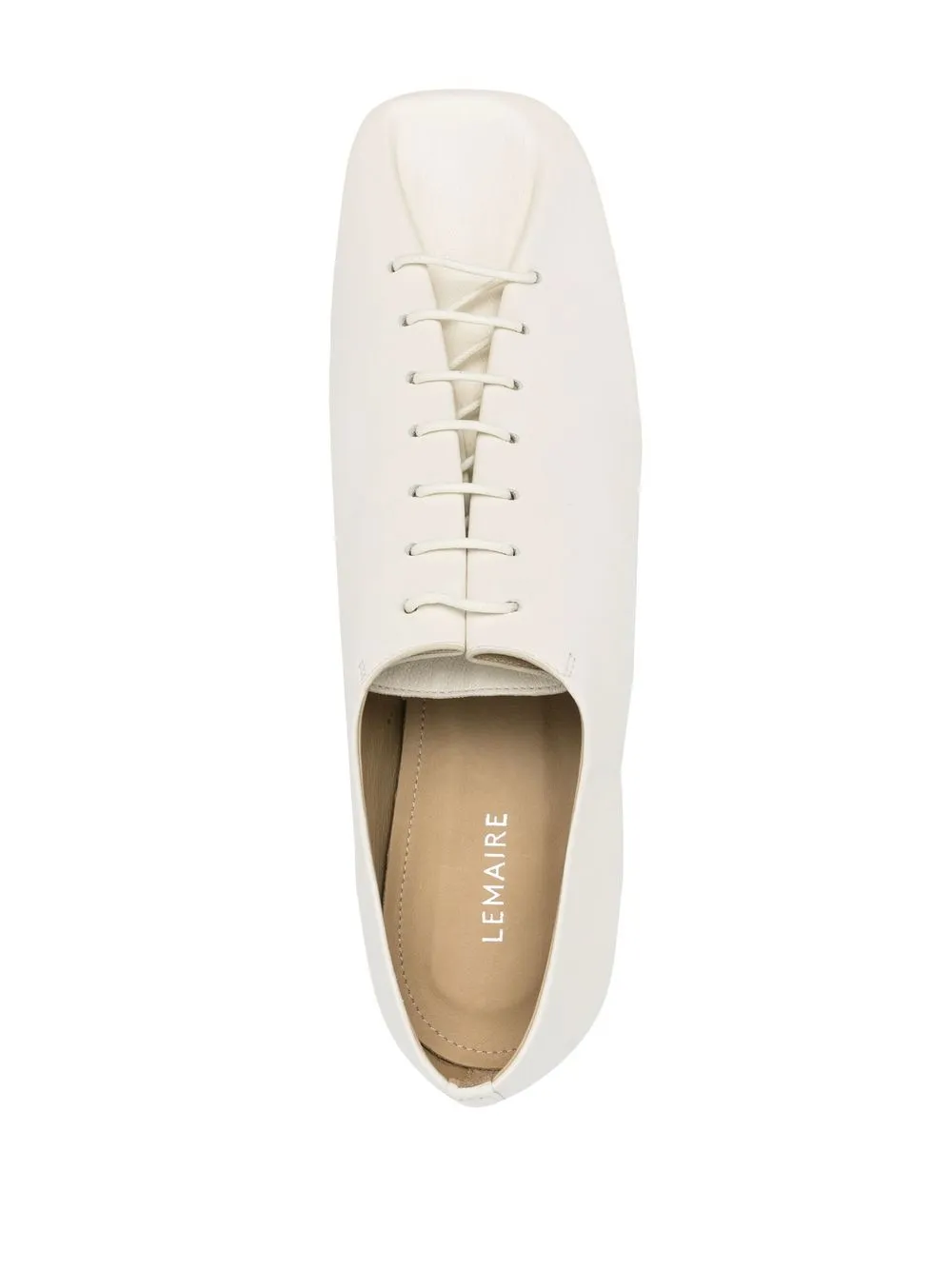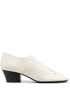 Drawing inspiration from dancers shoes, these smooth derby shoes by Lemaire feature a slightly rounded, square toe. Crafted in a tonal leather design, the lace-up pair are set upon a Cuban heel for a sophisticated completion.