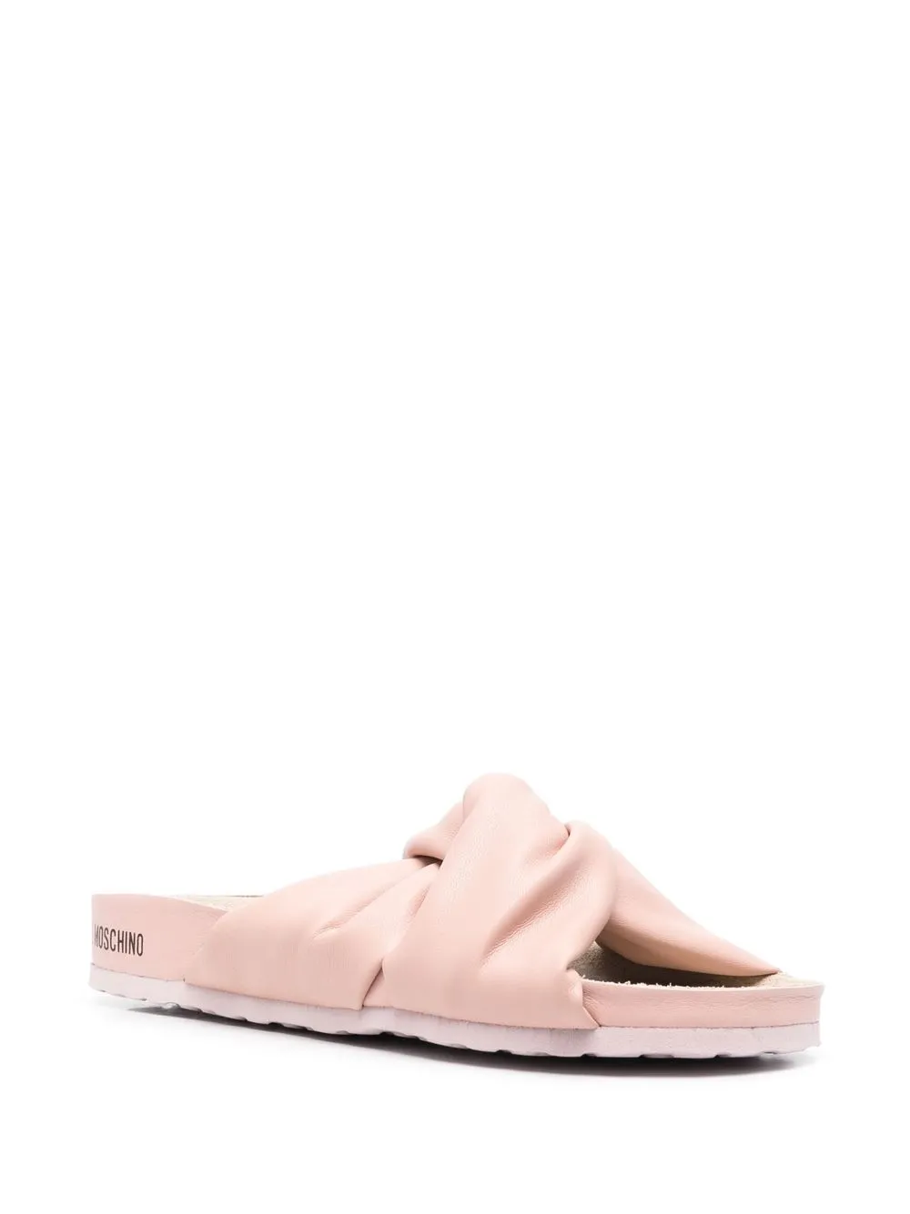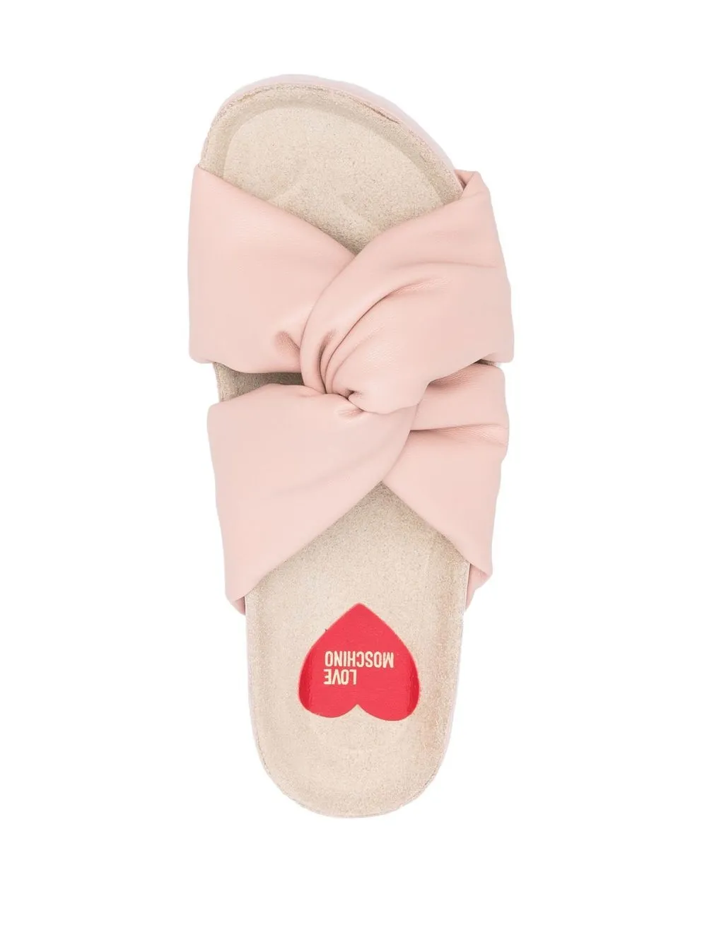 Light pink sheepskin/leather knot-detail slides from LOVE MOSCHINO featuring logo at the sole, twist detailing, open toe and flat rubber sole.