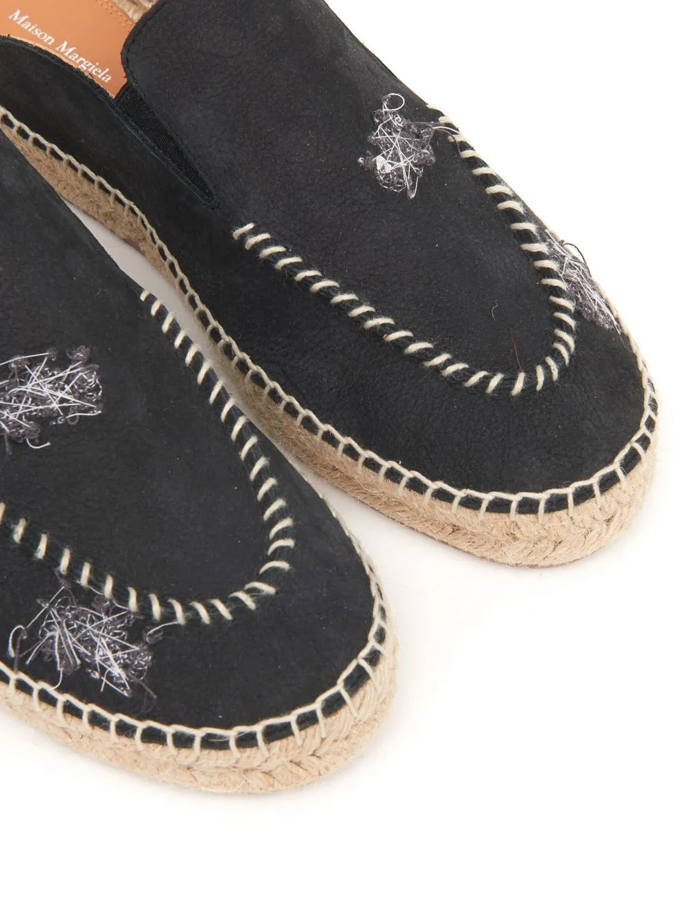 rope-sole leather mule from Maison Margiela featuring black, calf leather, decorative stitching, rope sole, round toe and slip-on style.