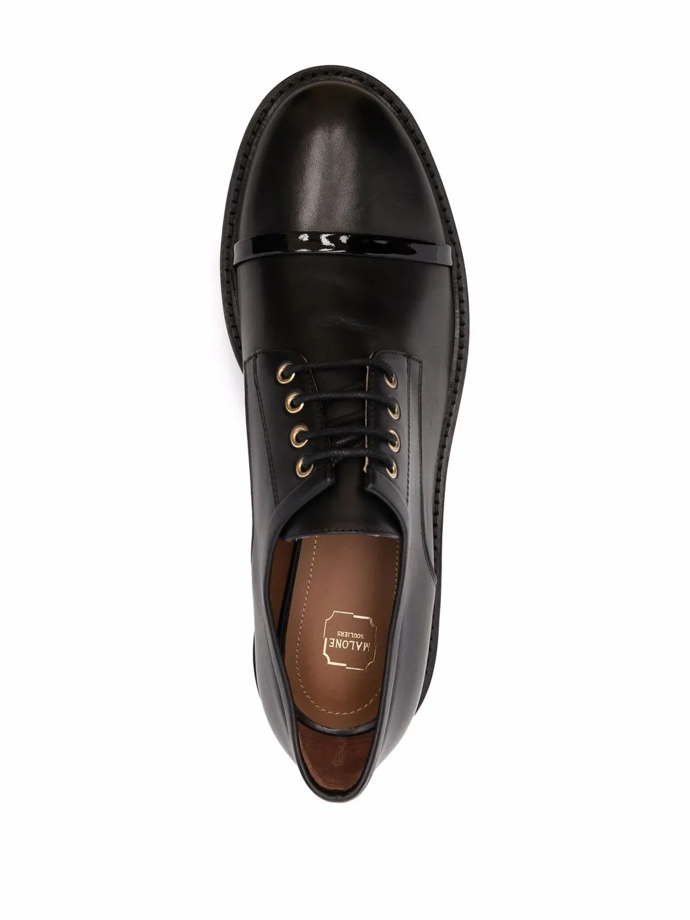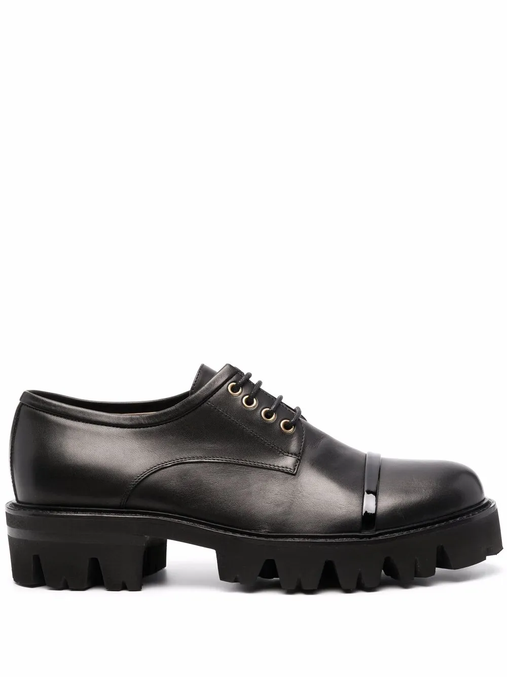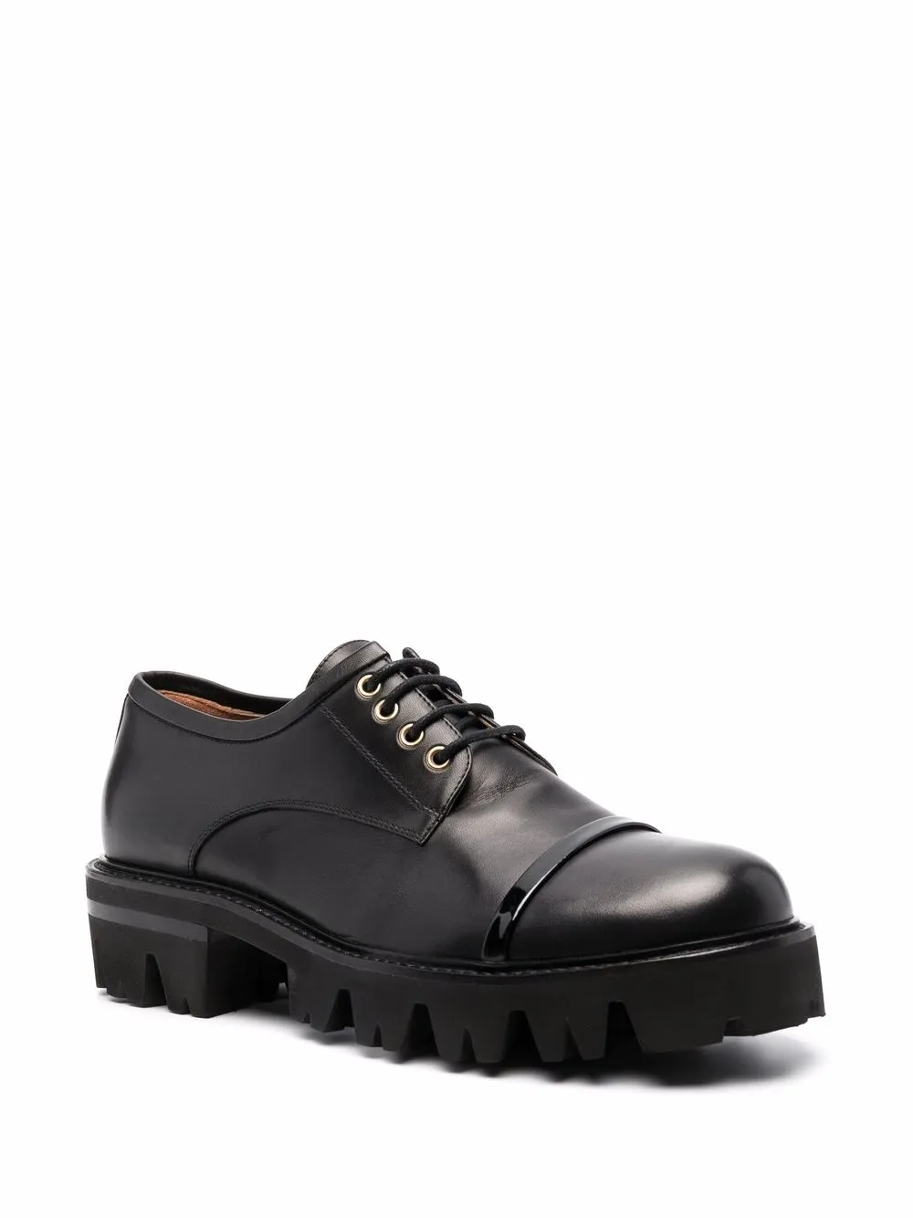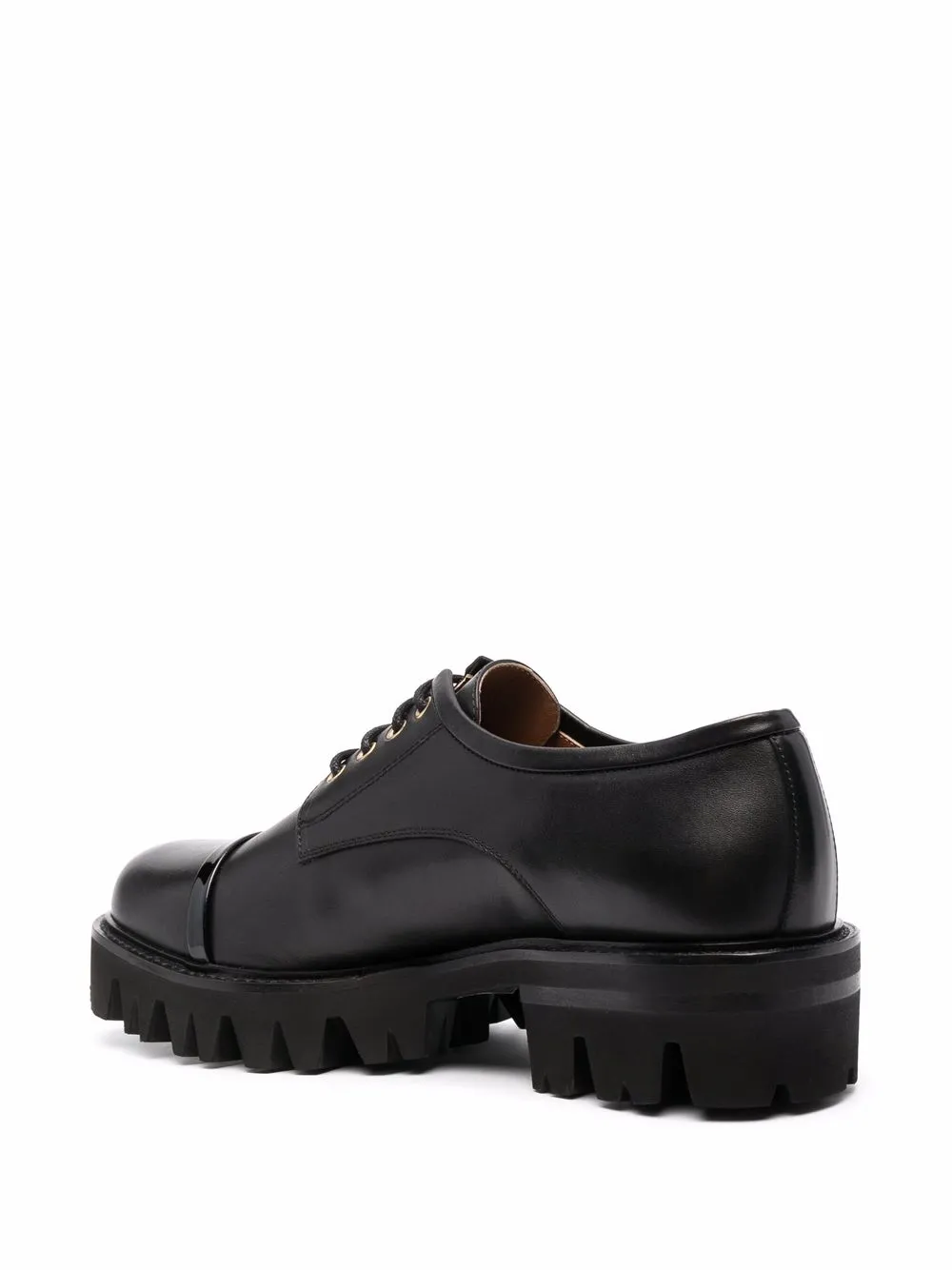 Black leather chunky sole lace-up shoes from Malone Souliers featuring round toe, front lace-up fastening and ridged rubber sole.