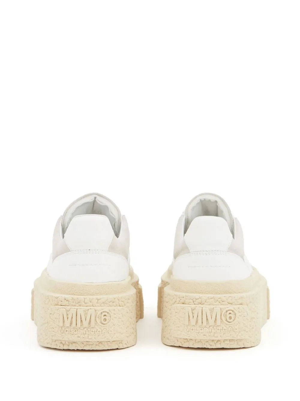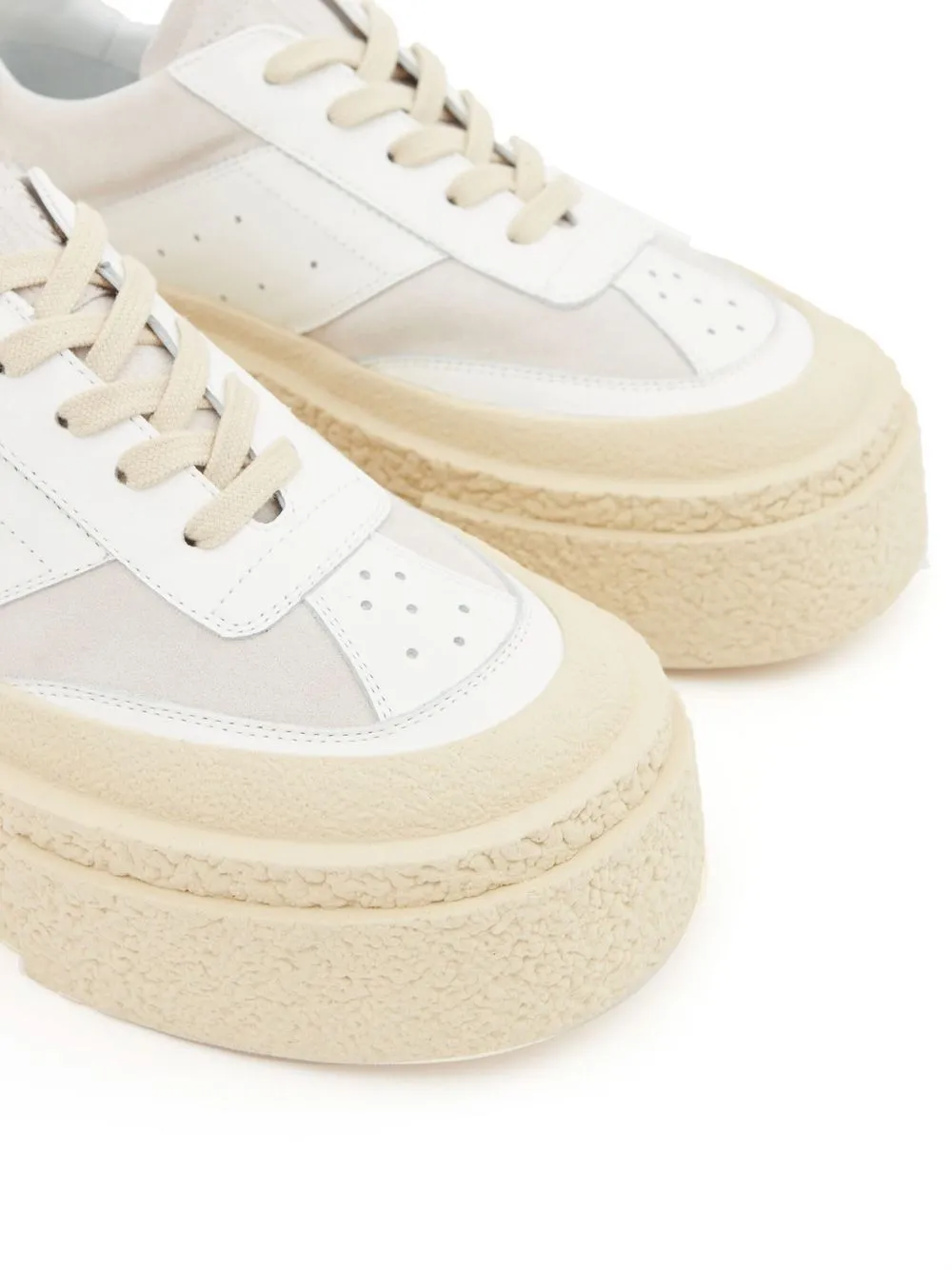 panelled low-top sneakers from MM6 Maison Margiela featuring white, beige, panelled design, perforated detailing, branded insole, almond toe, front lace-up fastening and chunky rubber sole.