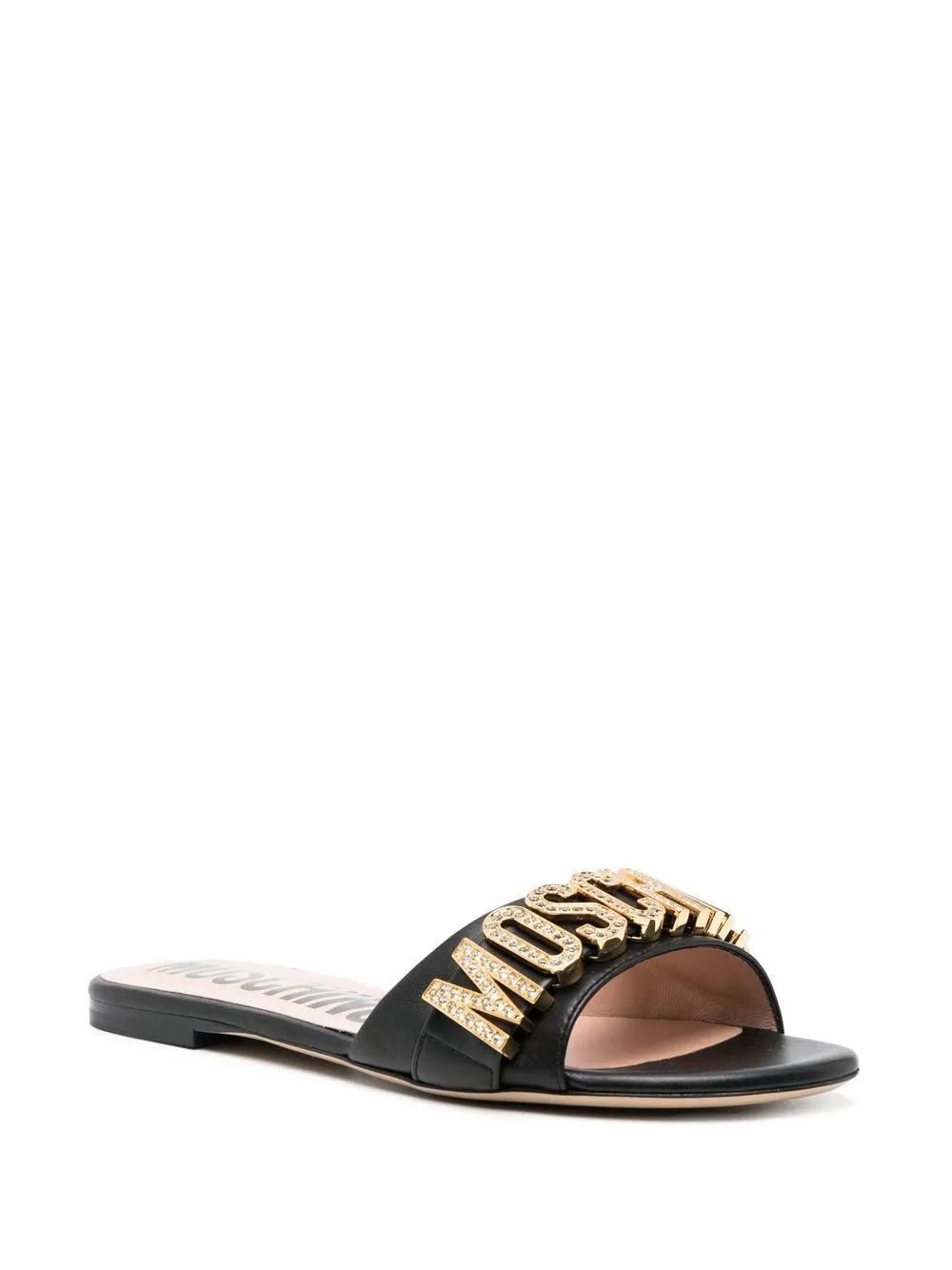 open-toe calf-leather slides from MOSCHINO featuring black, calf leather, gold-tone logo lettering, open toe, single toe strap, branded insole, flat sole and slip-on style.