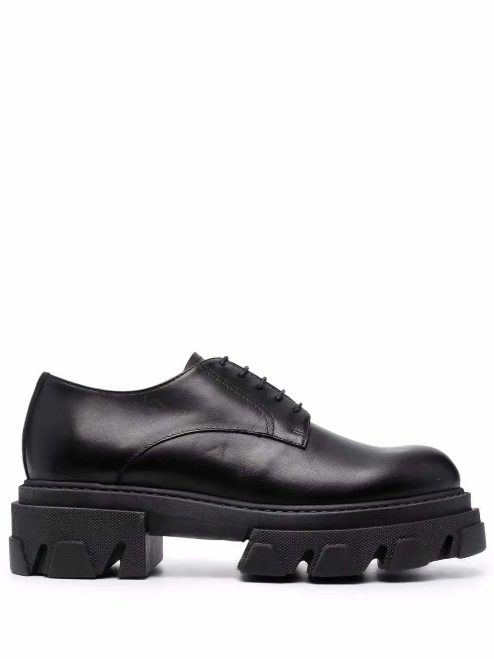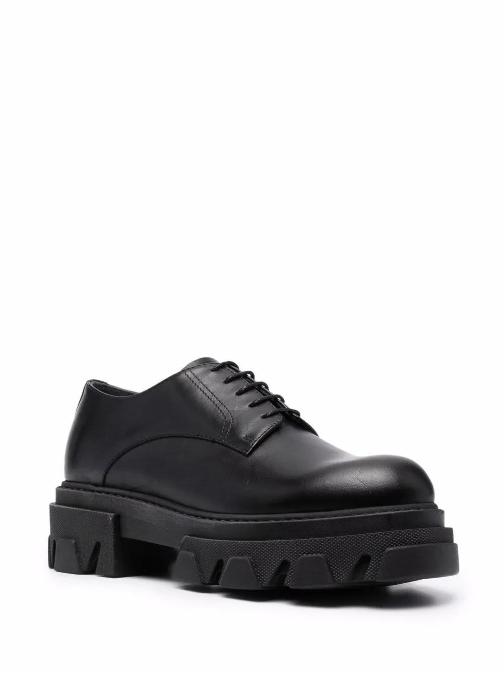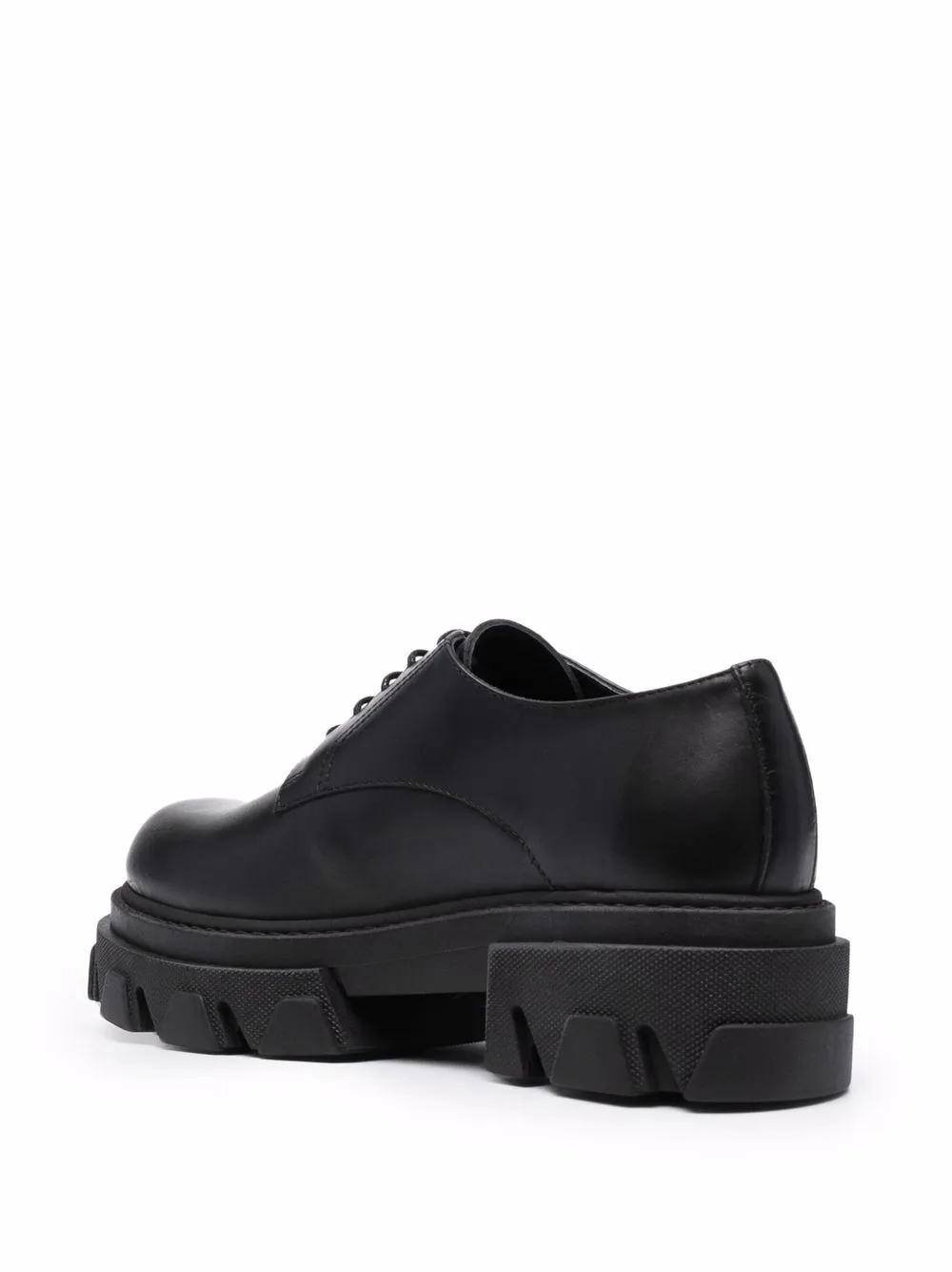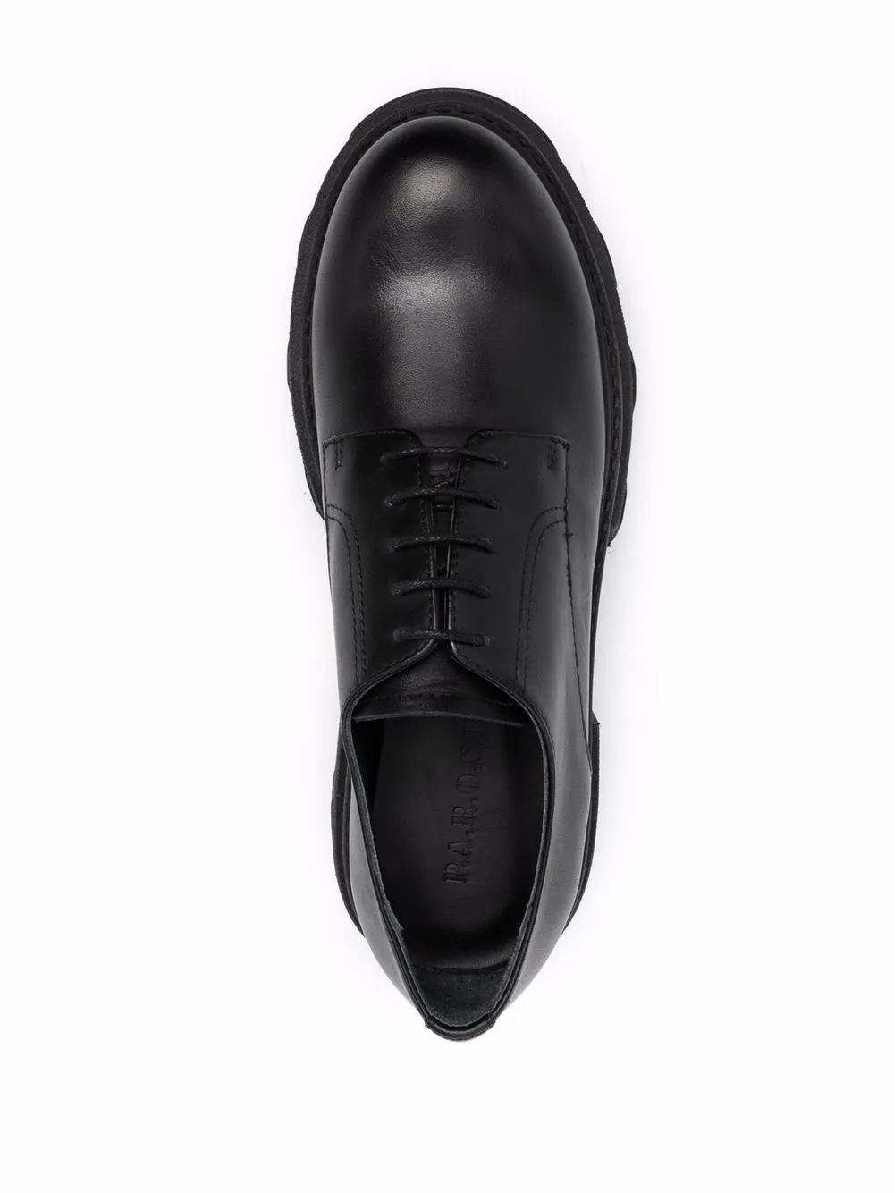 Black calf leather lace-up chunky-sole shoes from P.A.R.O.S.H. featuring almond toe, front lace-up fastening, branded leather insole and chunky rubber sole.