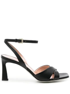square-toe 80mm sandals from POLLINI featuring black, calf leather, crossover strap at the toe, square toe, buckle-fastening ankle strap, branded footbed and high heel.