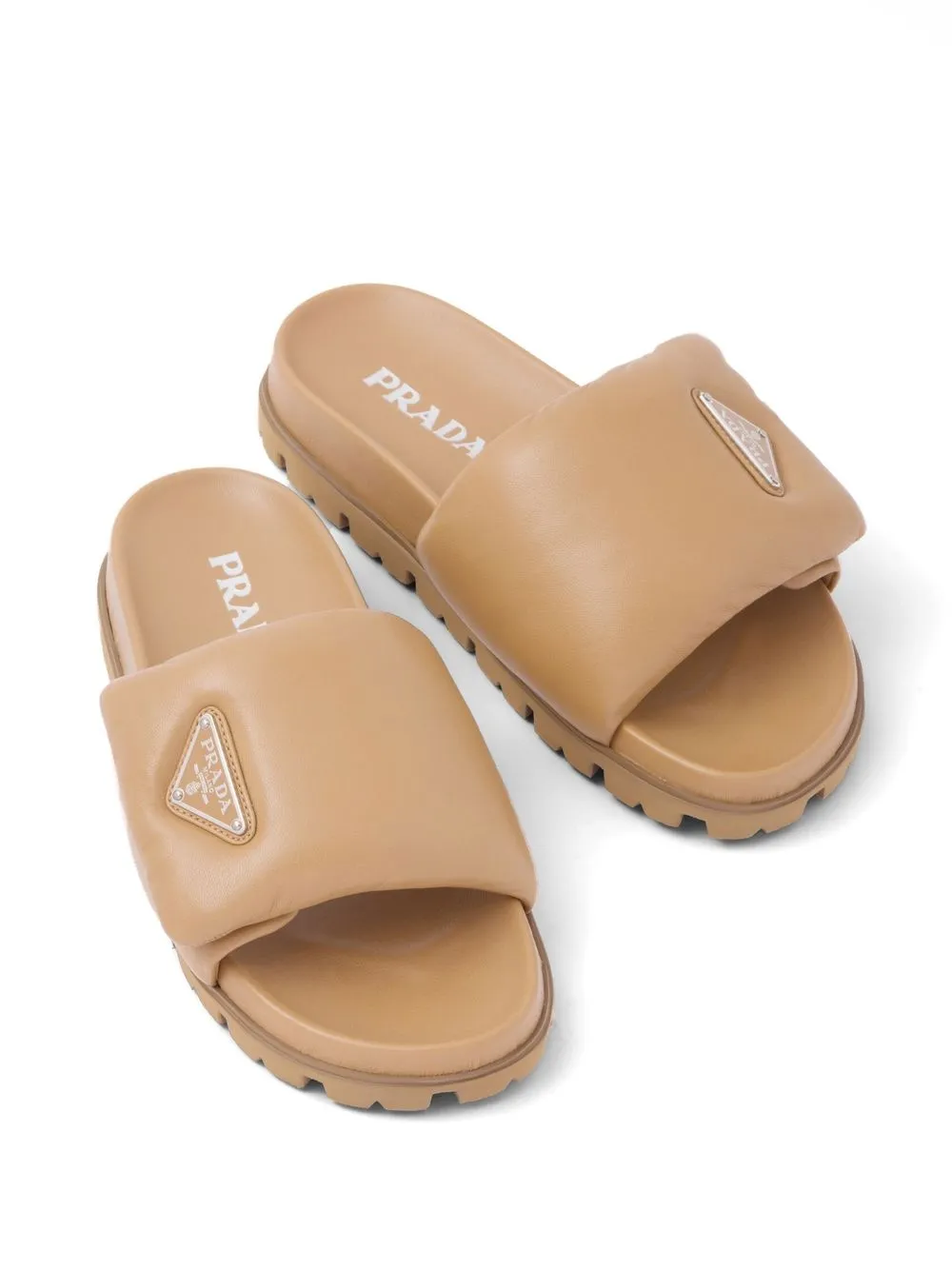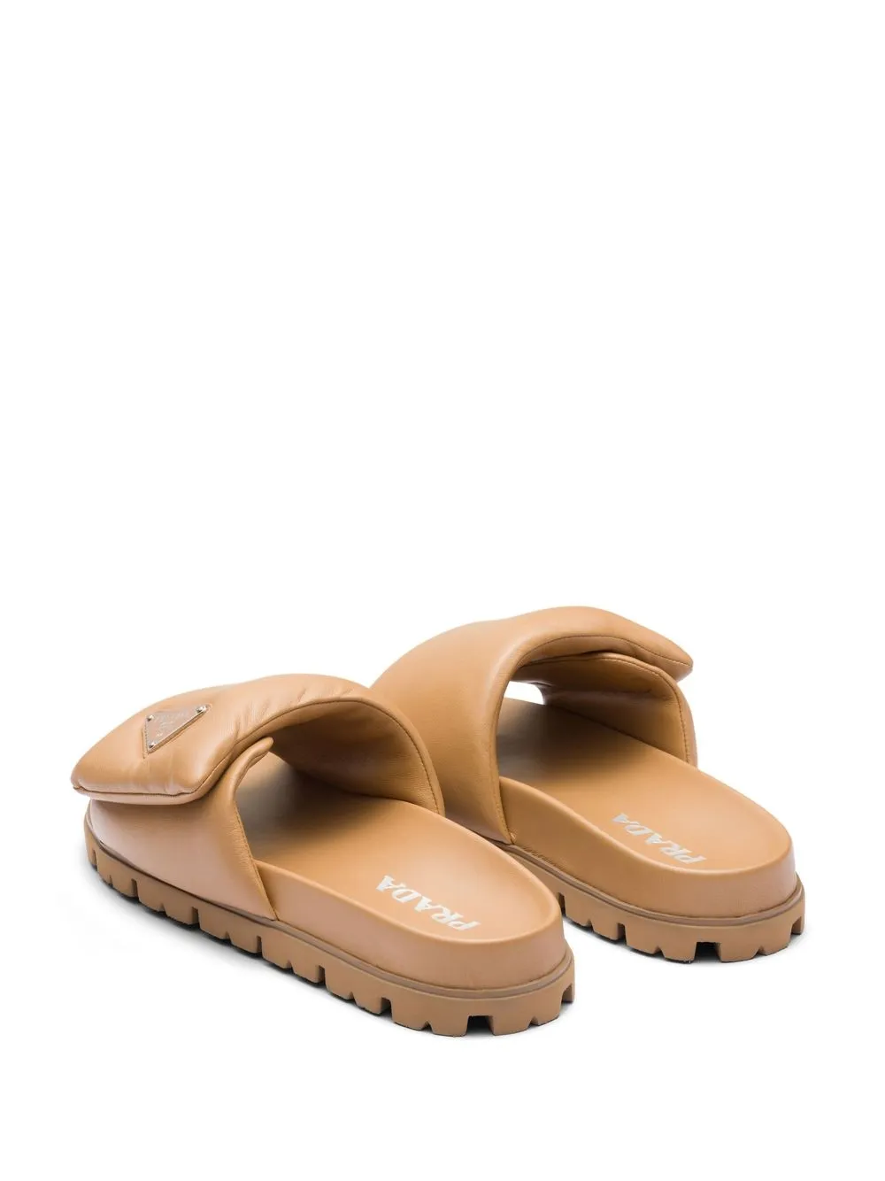 Prada explores nostalgic influences in the design of these caramel-brown leather slides. Inspired by minimalist ’90s styles, they’re adorned with the brand’s enamelled triangle logo plaque, referencing archival codes.