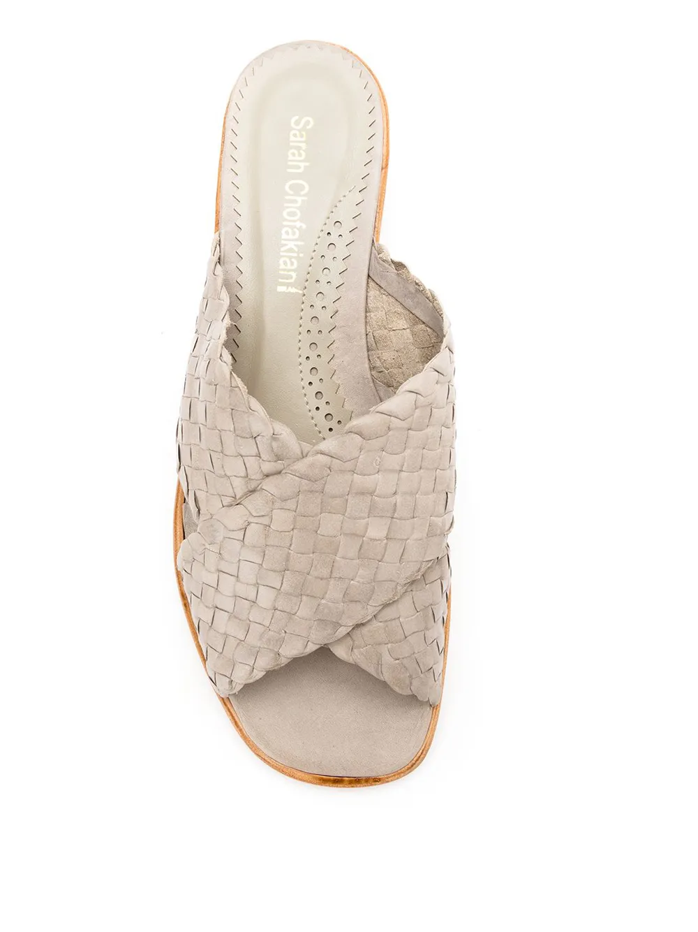 Beige goat skin crossover strap sandals from Sarah Chofakian featuring a slip-on style, an open toe, a branded insole and a flat sole.
