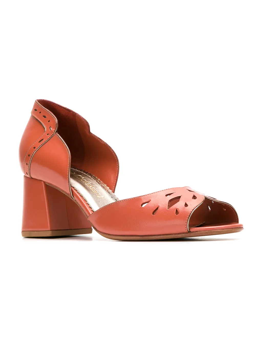 Orange leather pumps from Sarah Chofakian featuring an open toe, a chunky mid-heel, a round toe and cut out details.