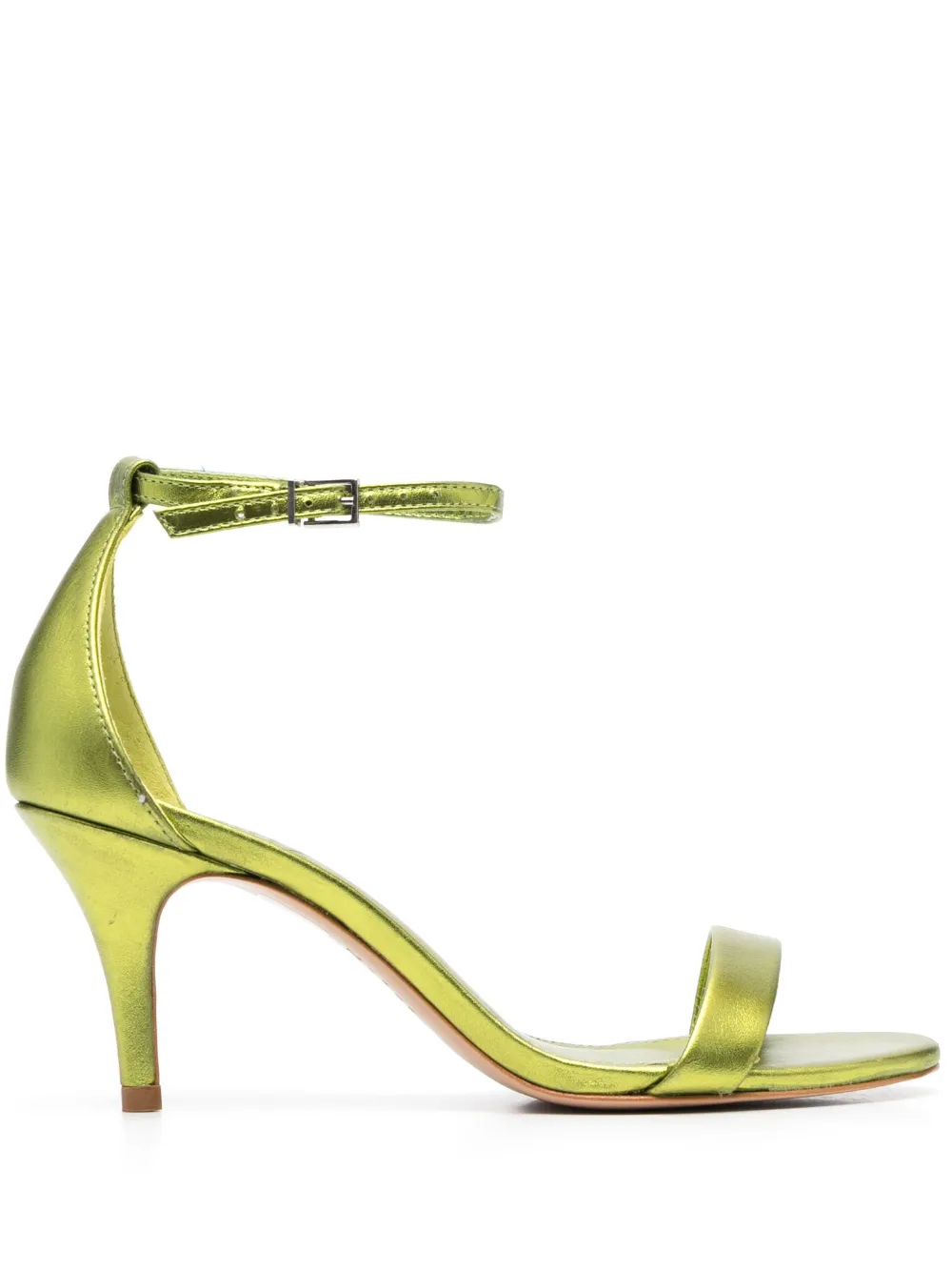80mm metallic-effect leather sandals from SCHUTZ featuring lime green, calf leather, metallic effect, open toe, buckle-fastening ankle strap, high cone heel and branded leather insole.