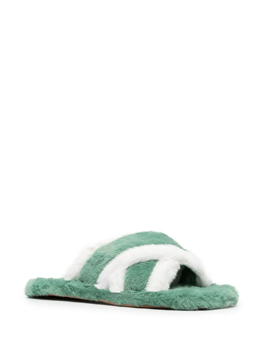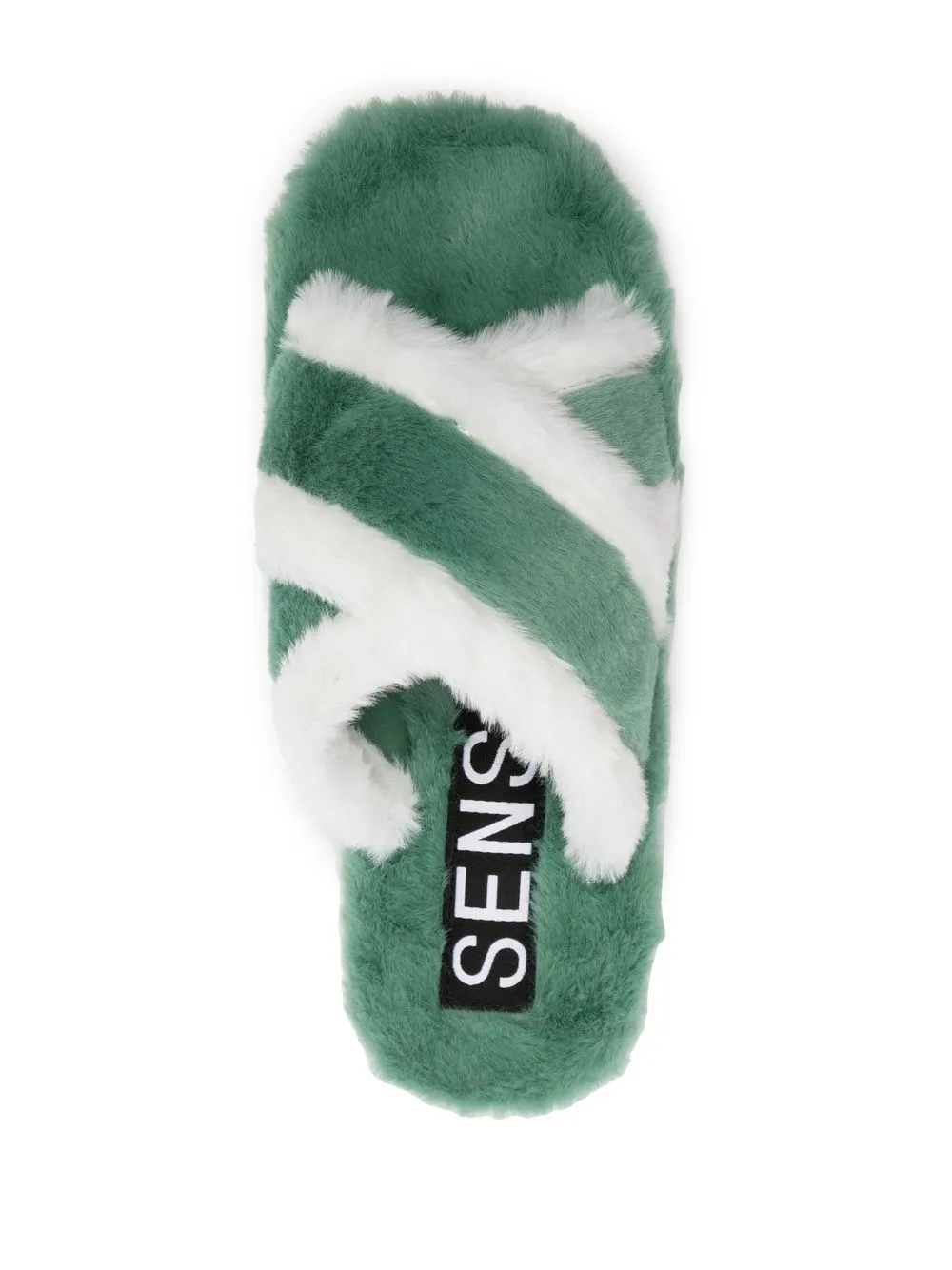Irah II crossover-straps slippers from SENSO featuring dark green, white, open toe, crossover strap at the toe, slip-on style and flat sole.