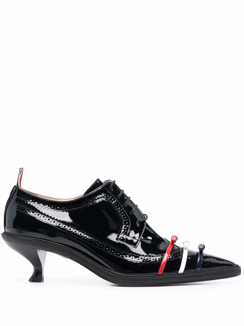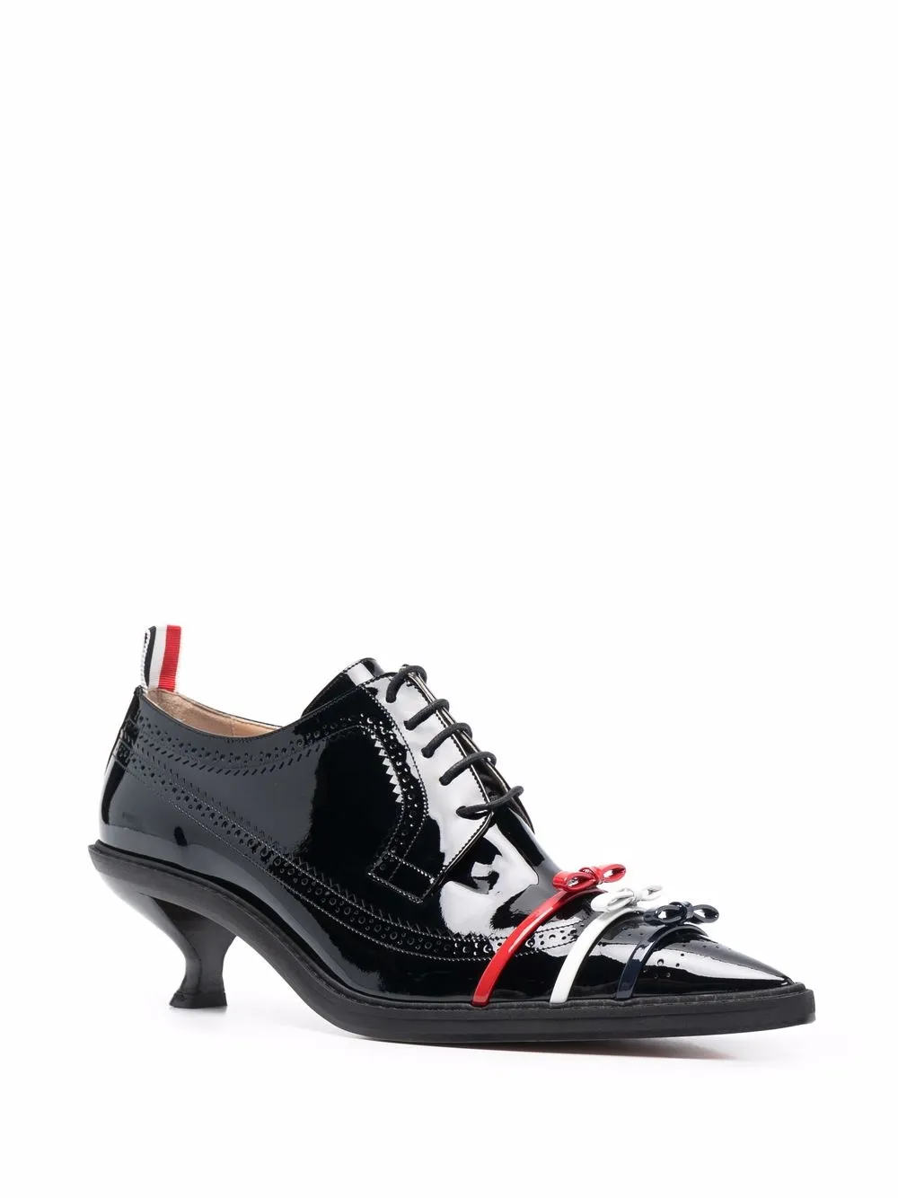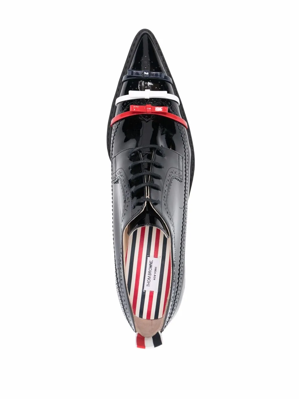 These lace-up shoes from Thom Browne combine both style and comfort. Crafted from patent leather, the pair is accented with a multicolour three bow detail on top and the usual grosgrain loop tab at the rear.