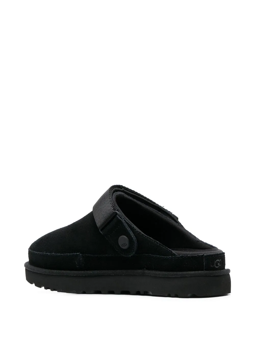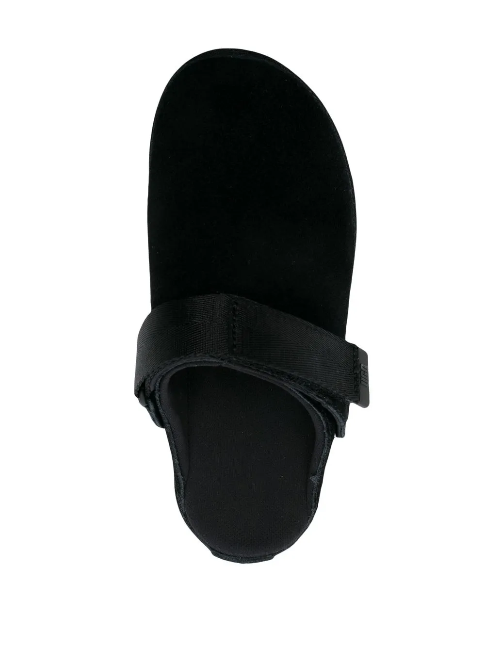 touch-strap suede slippers from UGG featuring black, calf suede, front touch-strap fastening, adjustable strap to the front, logo patch to the side, round toe, slip-on style and flatform sole.