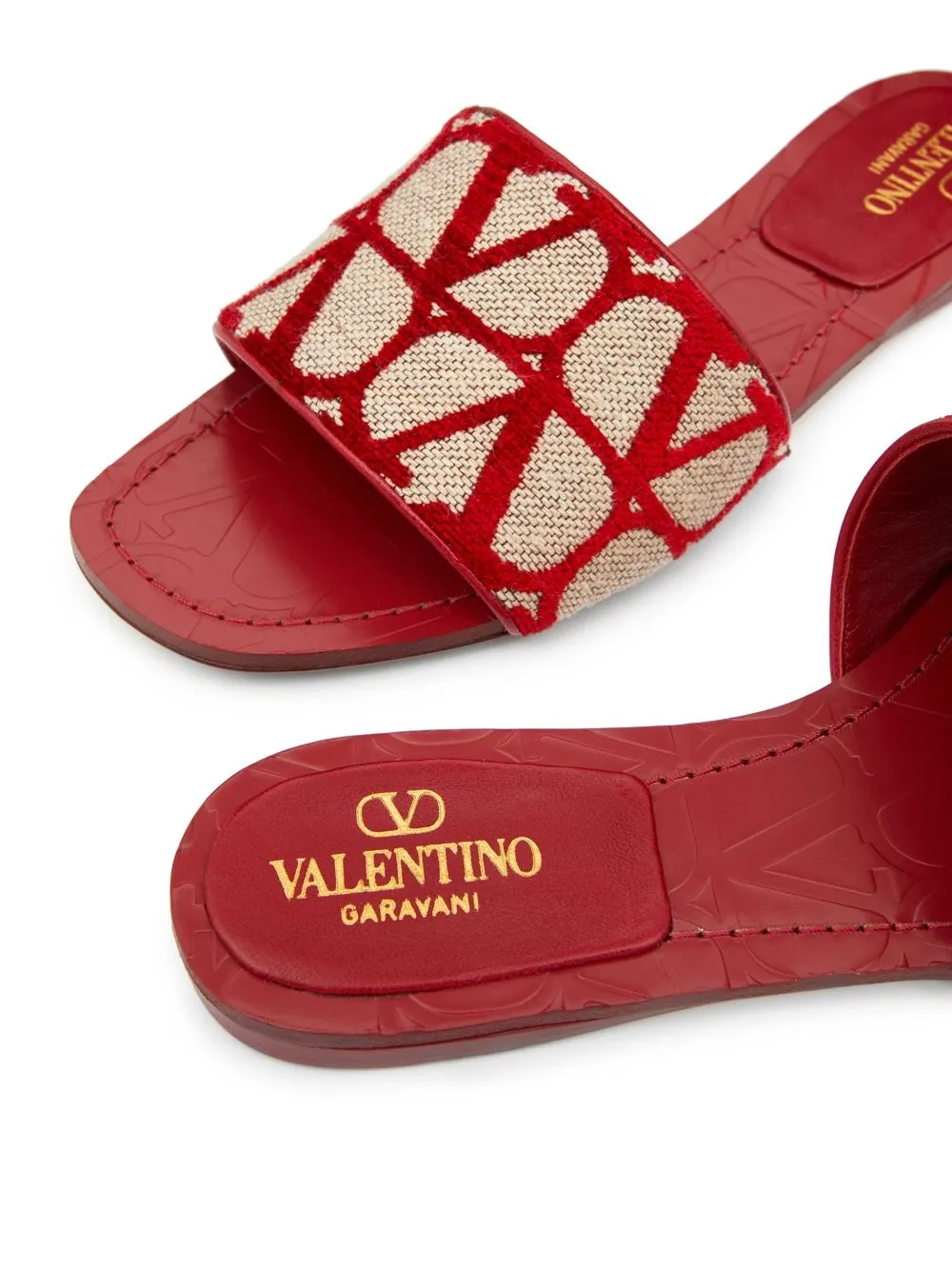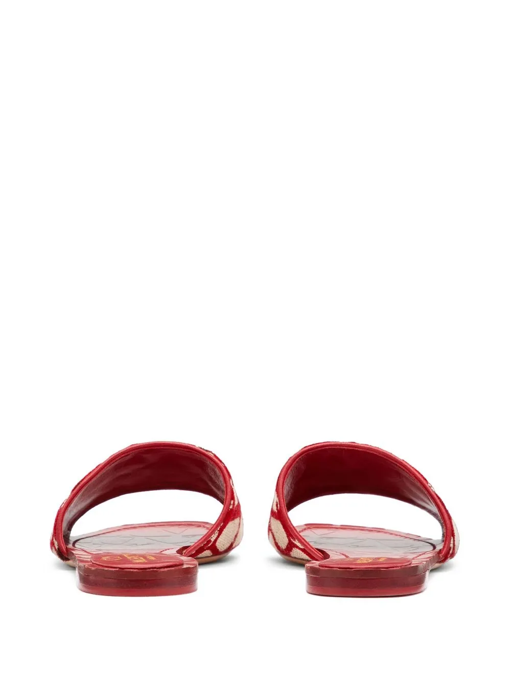 Exploring the aesthetics of the ’70s, Valentino presents a hypnotic take on the iconic VLogo Signature for SS23 with the Toile Iconographe pattern that adorns these open-toe slides.