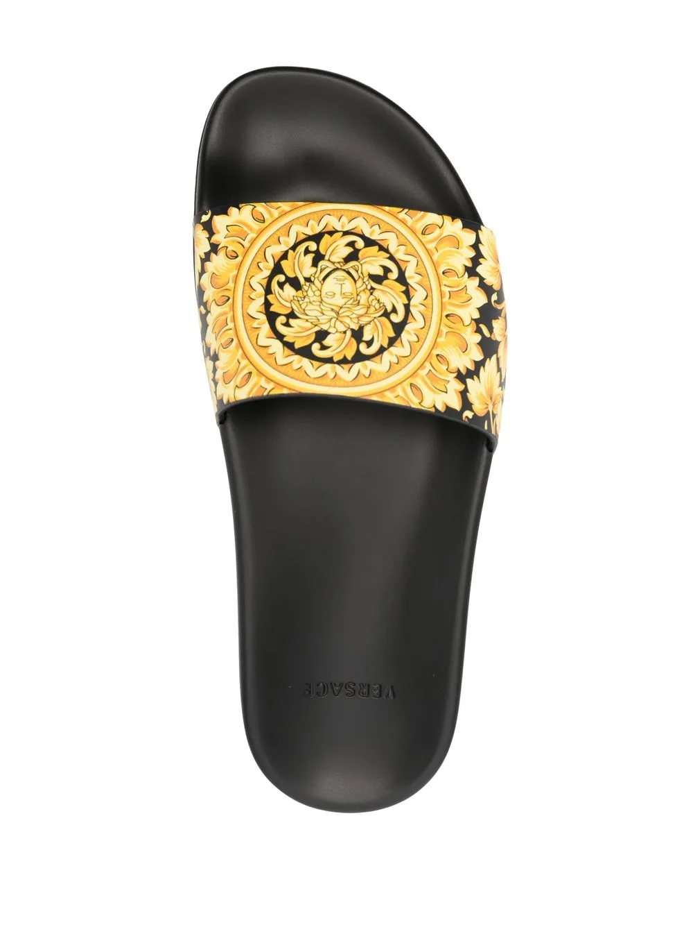 Baroque-print rubber slides from VERSACE featuring black, gold-tone, baroque-pattern print, open toe, branded insole, moulded footbed and slip-on style.