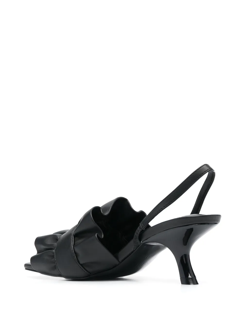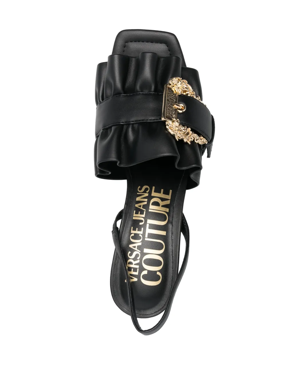 Baroque-buckle ruffled sandals from VERSACE JEANS COUTURE featuring black, ruffled detailing, gold-tone buckle fastening, open toe, square toe, elasticated slingback strap, branded insole and kitten heel.