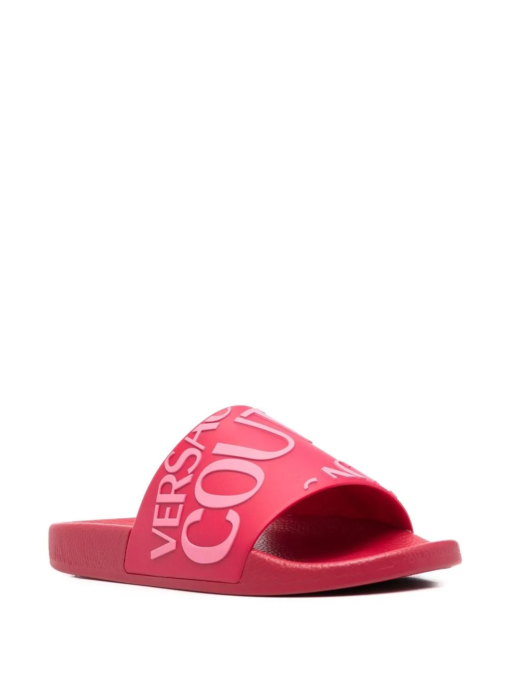 logo-print beach sliders from VERSACE JEANS COUTURE featuring pink, slip-on style, logo print to the front, open toe, branded insole, moulded footbed and flat rubber sole.